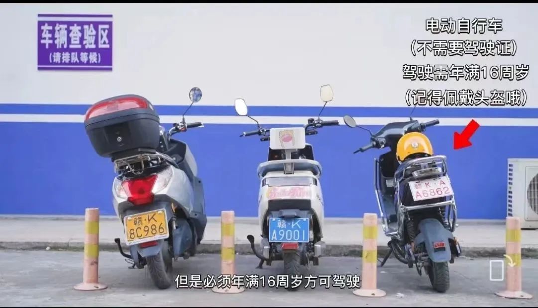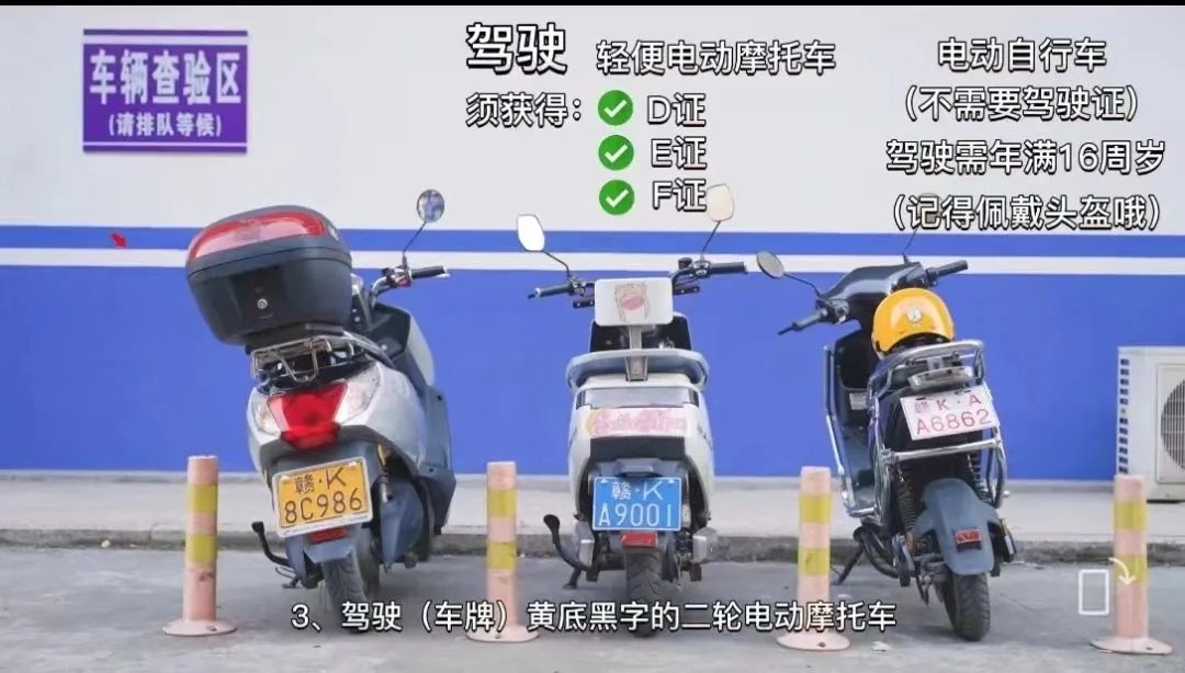 上图右一电动自行车,简单来说就是白牌红字,这类车属于非机动车,上道路行驶是不需要驾驶证的,但驾乘这类车辆出行应佩戴安全头盔!根据《江西省实施〈中华人民共和国道路交通安全法〉办法》第五十二条规定,电动自行车限载一名十二周岁以下未成年人;搭载学龄前儿童的,应当使用安全座椅。《江西省非机动车管理办法》第十九条规定,鼓励上道路行驶的电动自行车、残疾人机动轮椅车参加相关责任保险。02