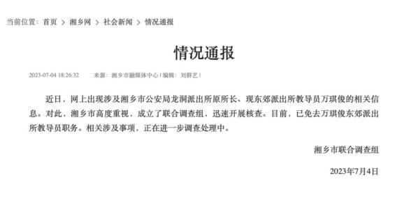 截图来源:湘乡网4日,湘乡市联合调查组发布情况通报:近日,网上出现涉及湘乡市公安局龙洞派出所原所长、现东郊派出所教导员万琪俊的相关信息。对此,湘乡市高度重视,成立了联合调查组,迅速开展核查。目前,已免去万琪俊东郊派出所教导员职务。相关涉及事项,正在进一步调查处理中。
