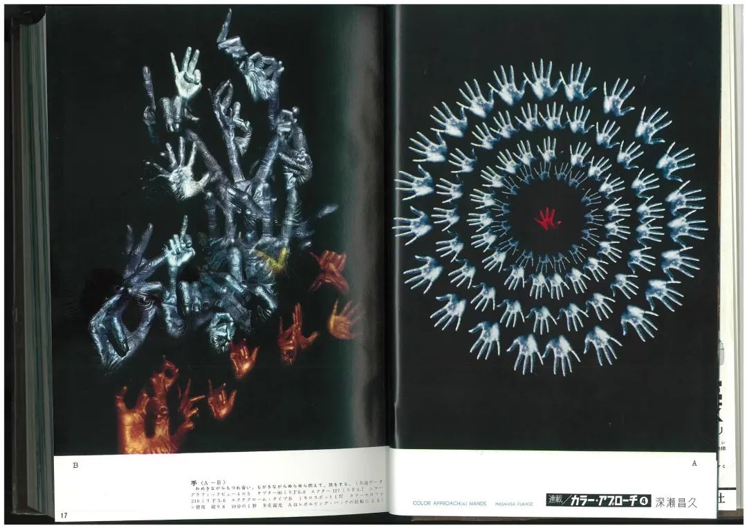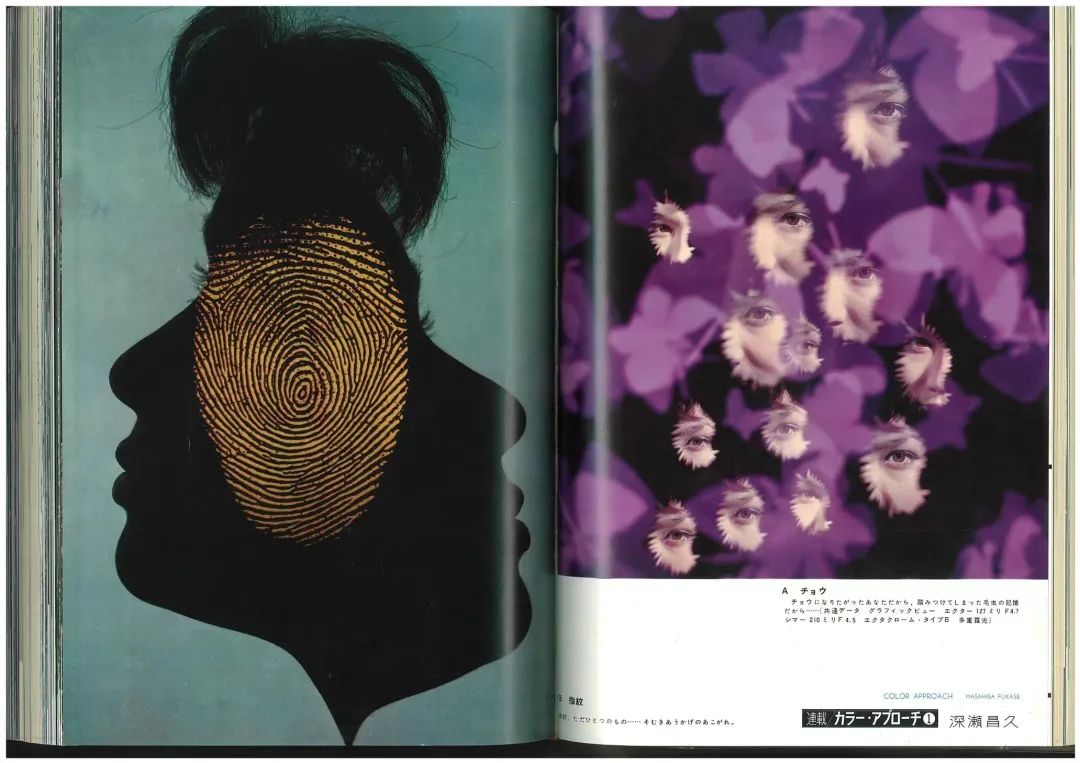 可能大家对于深濑的印象,最开始都是《乌鸦》这个系列,但是其实《乌鸦》是算中期制作的一个作品,在深濑早期的作品中,可以看到非常多这种彩色实验的摄影表现。然后这个杂志的扫描是1962年的《每日相机》上的连载,可以看到其实深濑运用了非常多这种多重曝光等等的手法去表现,他想要去尝试不是直接拍摄的这种手法去尝试摄影更多的可能性。