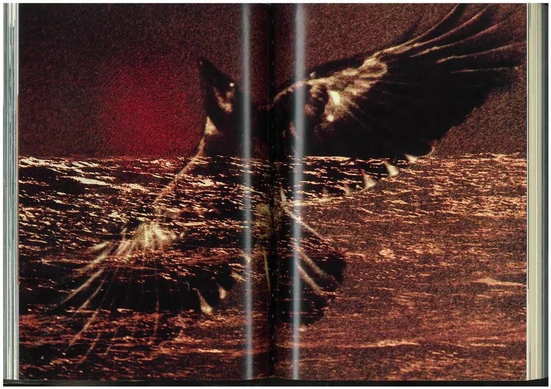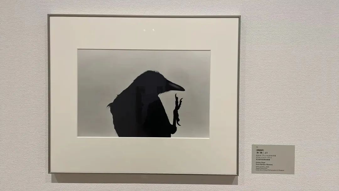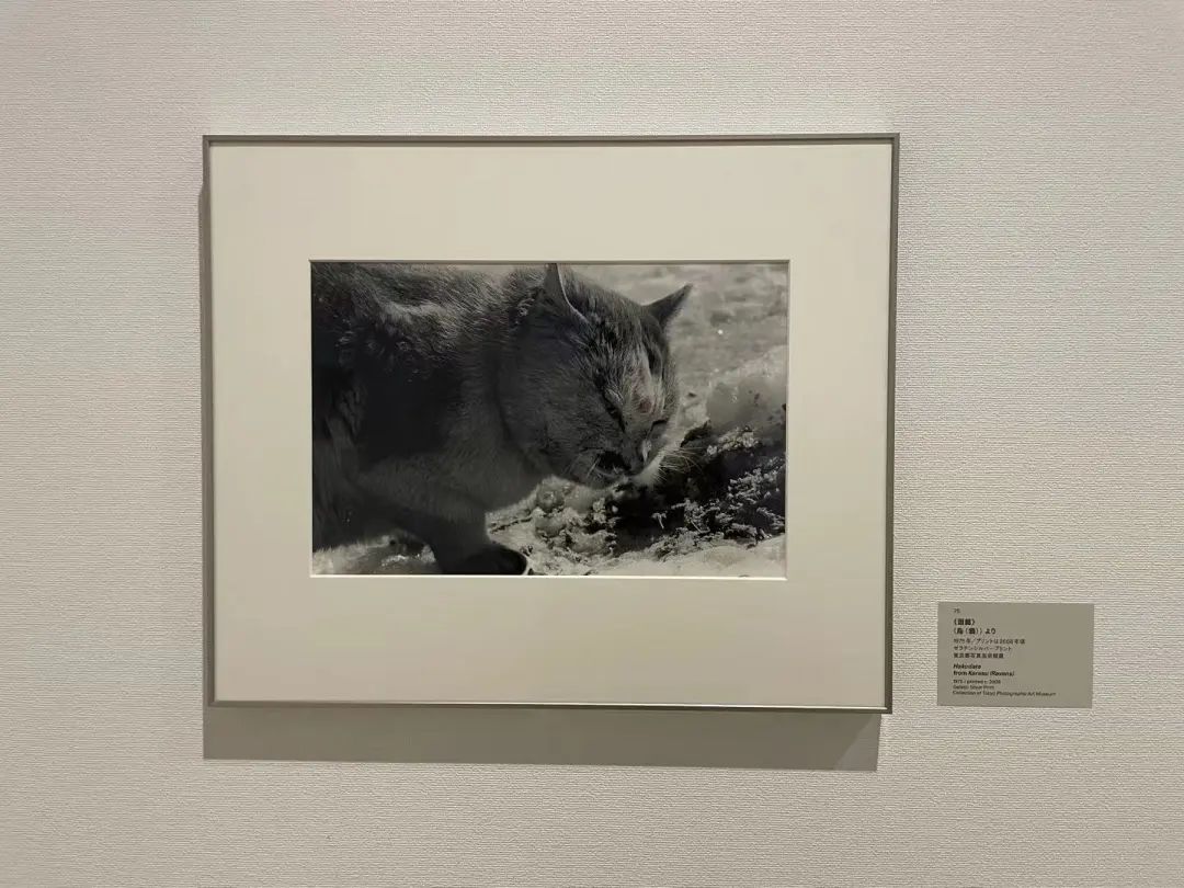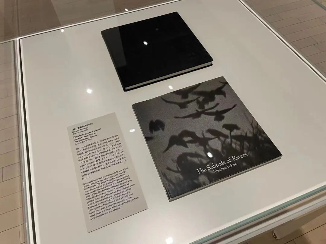 下一个展览空间里是《乌鸦》的作品。这一组作品可以说是深濑的巅峰之作,相信提到深濑昌久,大家的第一印象也应该就是乌鸦吧。这一次展示的空间设计我非常喜欢,也是因为乌鸦的展示空间处于展厅的正中间,然后,但是因为有两个承重柱,按道理来说其实是会影响观看感受的,但是乌鸦的展示空间被设计成一个长方形的空间,并且承重柱上也展示了作品,所以这个空间打通了展厅的前后位置,同时构成了一个开放式的空间,它就没有一个固定的观看路线,所以观看的感受是非常自由的,而且也放置了深濑昌久早期在杂志上的乌鸦的连载作品。大家对于乌鸦的印象可能大多数是黑白,但是其实深濑也尝试了很多彩色的表现,也展示了乌鸦的不同版本的摄影集。有兴趣的话大家可以搜一下翻书的视频。接下来就是深濑的《sakuse》,就是拍摄猫的作品,《行走的眼》和《私景》。《私景》这个作品也非常有意思,算得上是早期自拍意识的作品了,深濑把自己融入在风景里自拍。最近赤赤社也出版了《私景》的写真集,大家有兴趣的也可以去购买一本看一看。
