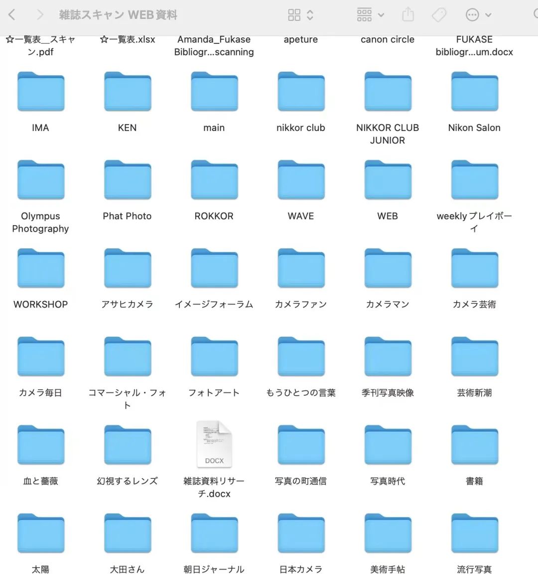 每个文件夹里面都会有不同年份的扫描资料,就是说深濑他在每个年份不同的月份去到各个不同杂志发表的作品都是不一样的,所以我觉得观看一个艺术家所有的作品,其实是可以很好的去帮助我们理解一个摄影师创作的历程。同时我也感受到这次空间设计和平面设计,图录的编辑和校阅,这些集体努力和协作的重要性。由于是深濑昌久的个展在疫情暂缓的时候,我也得到了大家的帮助,在跟随访谈的时候能够感受到他们身上对于日本摄影黄金时代的辉煌和对摄影的热爱以及对深濑的怀念和不舍,这也使得我们可以通过这次策展,回溯深濑在1970年代发表的作品,重新挖掘出深濑的多面性。今天的分享就到这里,非常感谢蚂蚁摄影提供这个平台,让我可以分享日本策划展览的经历,希望之后有机会还可以分享更多的摄影的研究内容,谢谢大家。