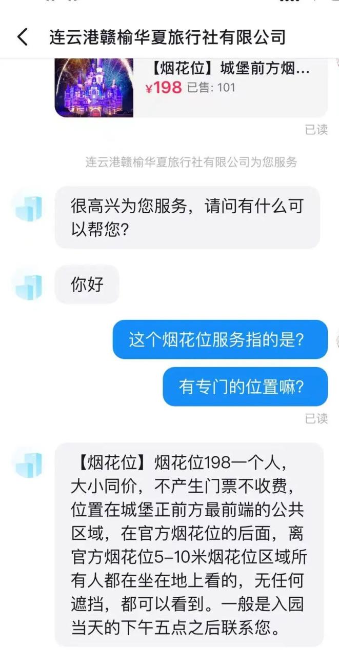 记者点击一个销量达到101件的商品链接进入,弹窗显示店铺名称为“连云港赣榆华夏旅行社有限公司”,客服介绍,烟花位大小同价,位于城堡正前方最前端的公共区域,在官方烟花位后面5-10米,所有人可坐在地上观看,无遮挡。