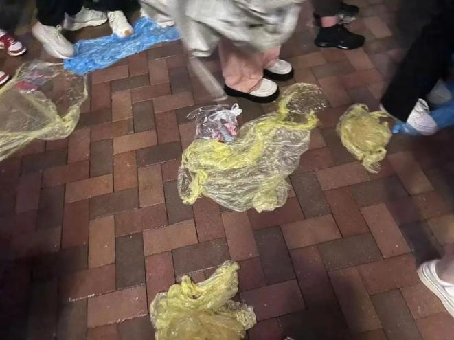 “导游”手一挥,指着“方阵”尾部湿漉漉的地面说,“就是这儿,你们坐。”说着,便从包里拿出几个一次性雨衣铺在地上,叮嘱记者一行在此等待,便径直离开了。此时,距离20时的奇幻光影秀开场,还有80多分钟。