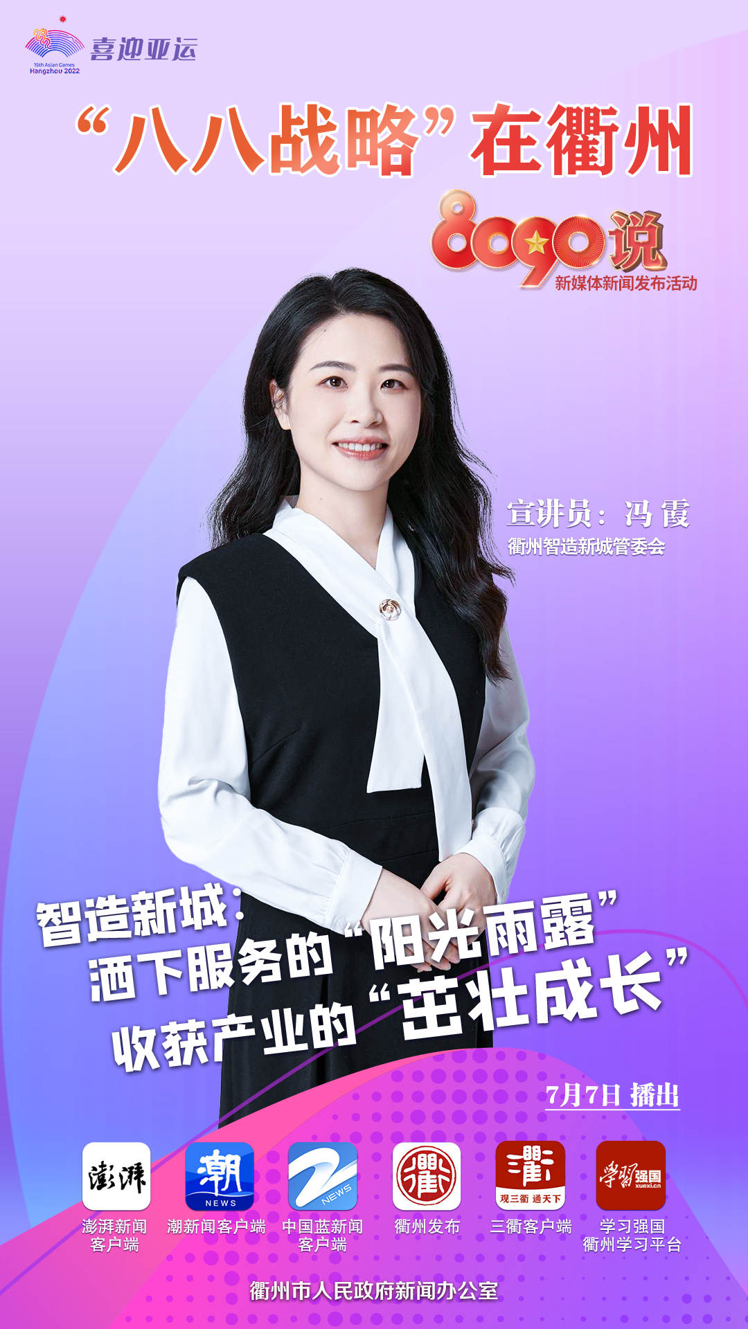 今年是“八八战略”实施20周年,也是习近平总书记对衢州8090新时代理论宣讲工作作出重要批示3周年,当“八八战略”遇上青年理论宣讲,将会迸发出怎样的火花,且听8090宣讲员用青年视角讲述党的创新理论的衢州实践。6月28日起,衢州市人民政府新闻办举行“八八战略”在衢州·8090说新媒体系列新闻发布活动。第八场请衢州智造新城管委会冯霞宣讲员介绍有关情况并回答提问。本场话题是《智造新城:洒下服务的“阳光雨露” 收获产业的“茁壮成长”》。