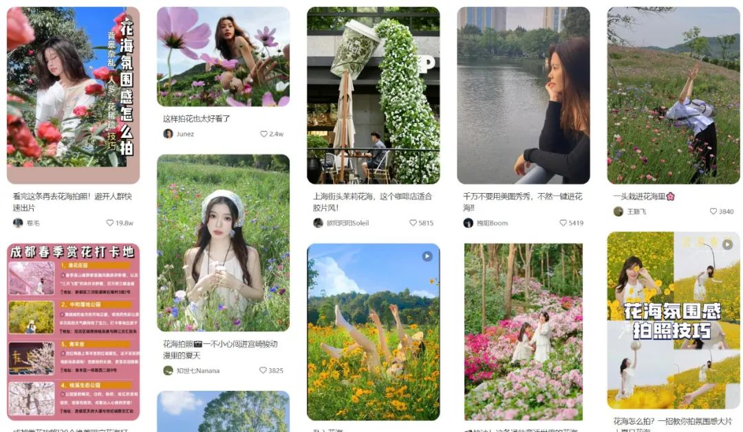 你的朋友圈里,也有不少花海中的年轻人吧?(图/小红书截图)不过,与拍照道具、拍照场景相比,大妈们充满想象力的拍照姿势至今还是很多人难以翻越的高峰。