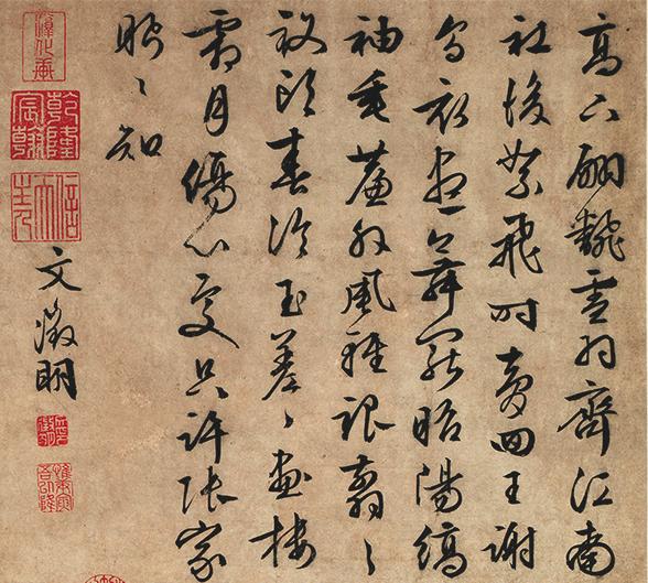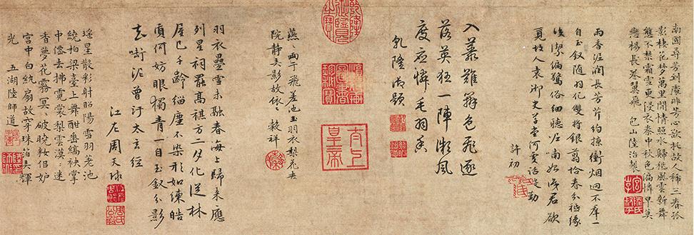 整幅图轴“字”比“画”多,数百年之间,文徵明、袁褧、许初、王榖祥、周天球、陆师道、彭年、文彭等多位吴门文士为这画卷次韵题诗。其师文徵明的亲笔题跋尤为经典,文辞优美,书法率意,诗、书、画浑然一体。