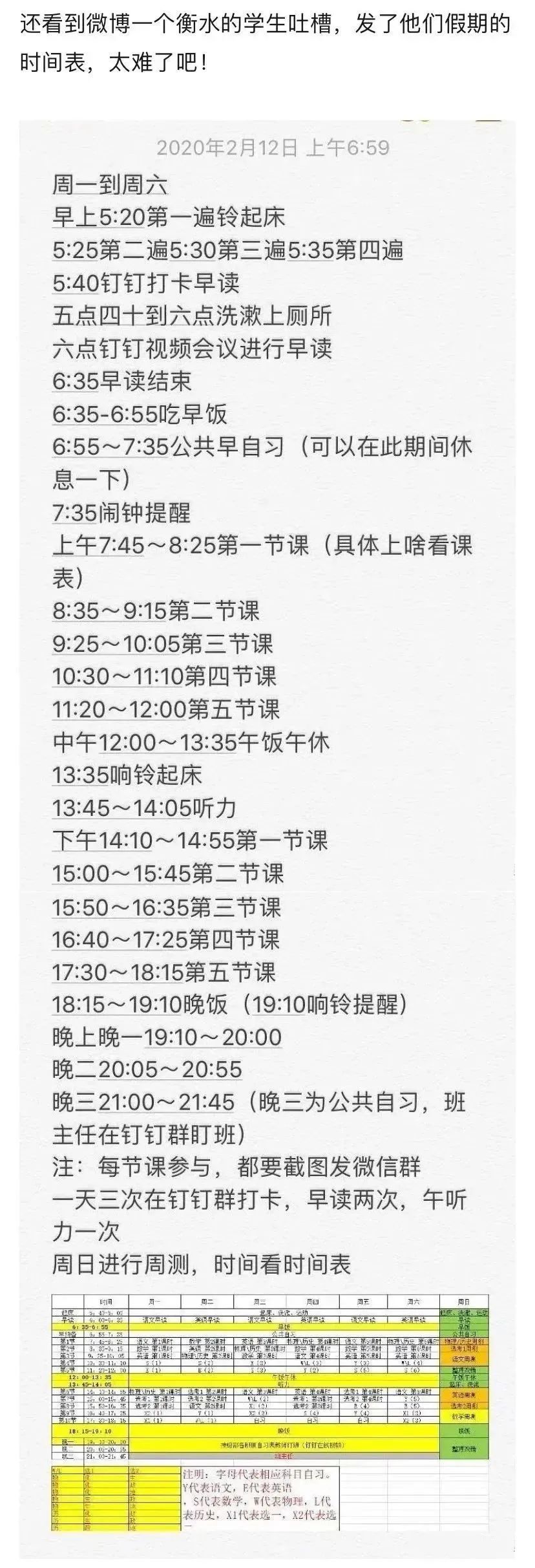 2020年新冠爆发,全国中小学开启线上教学,一份衡水中学的作息时间表被曝光。