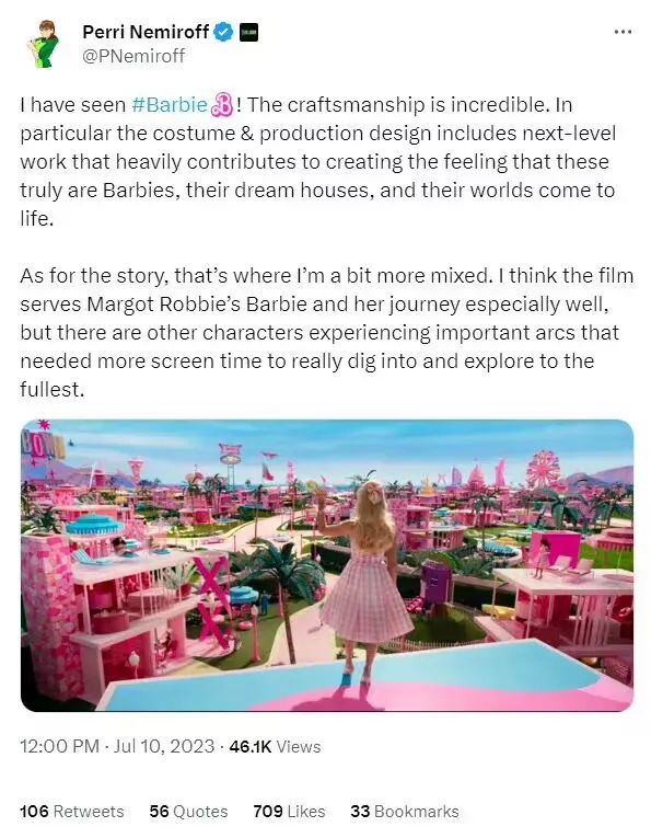 我认为这部电影很好地诠释了玛格特·罗比饰演的芭比和她的经历,但还有其他角色经历了重要的转折,需要更多的银幕时间来真正深入挖掘和探索。