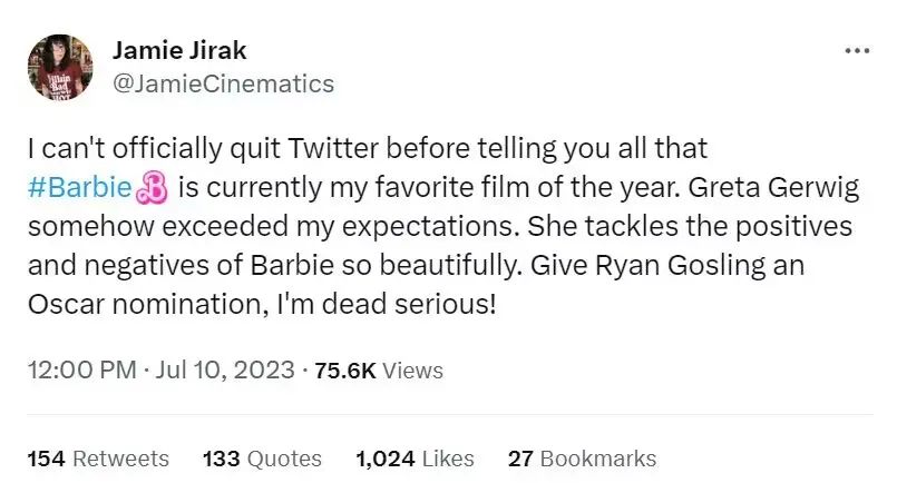 《ComicBook》Jamie Jirak:在正式退出推特之前,我得告诉所有人[芭比]是我今年目前为止最喜欢的电影。