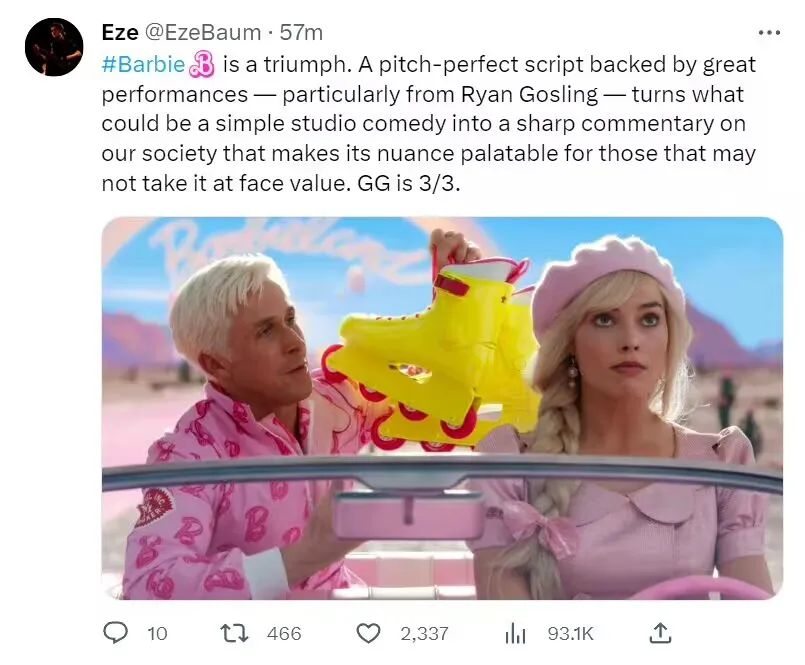 格蕾塔·葛韦格、玛格特·罗比、瑞恩·高斯林都被猛夸,部分评价如下↓