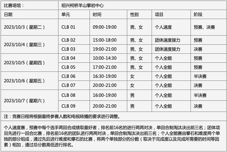 攀岩比赛项目包括速度赛、攀石赛、难度赛、个人两项全能赛。杭州亚运会攀岩项目比赛时间为10月3日—7日,在绍兴柯桥羊山攀岩中心举行,共产生6枚金牌。