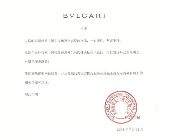 近日,有网友发现,在宝格丽品牌官网的店铺分布信息中,香港澳门前加了“中国”二字,而在台湾前并未加“中国”二字。该行为引发网友质疑,认为宝格丽此举是在将台湾单独列为一个国家。