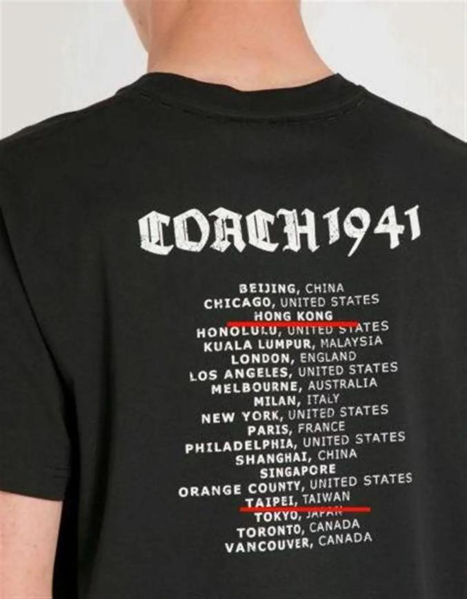 2018年5月,美国轻奢品牌蔻驰(COACH)发布的一款T恤,被网友翻出来并指其涉嫌分裂中国。图片里显示,Coach这款T恤背面分两列印有城市和国家名称,其中北京、上海的英文对应为中国,而在中国香港和中国台湾处却没有列为中国。