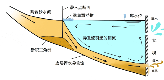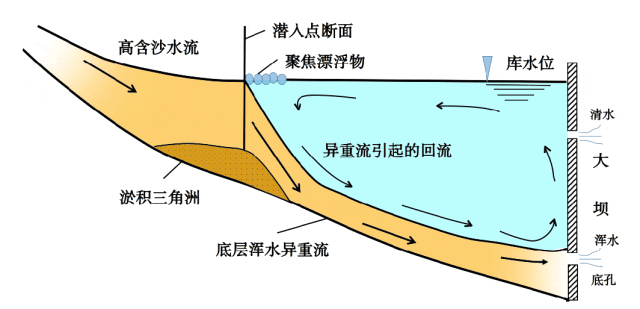 当高含沙水流进入水库遭遇库区清水后由于前者密度比后者大