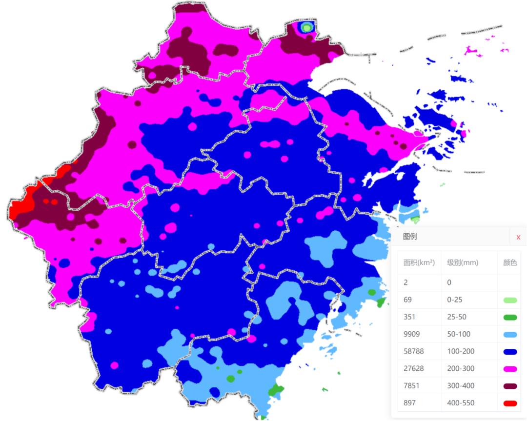 2023年全省梅雨期降雨量空间分布图而浙南地区的丽水、台州、温州三地降雨量较少,14个县(市、区)梅雨量小于100毫米,较小的为苍南县51.4毫米、龙港市55.7毫米、平阳县61.9毫米。
