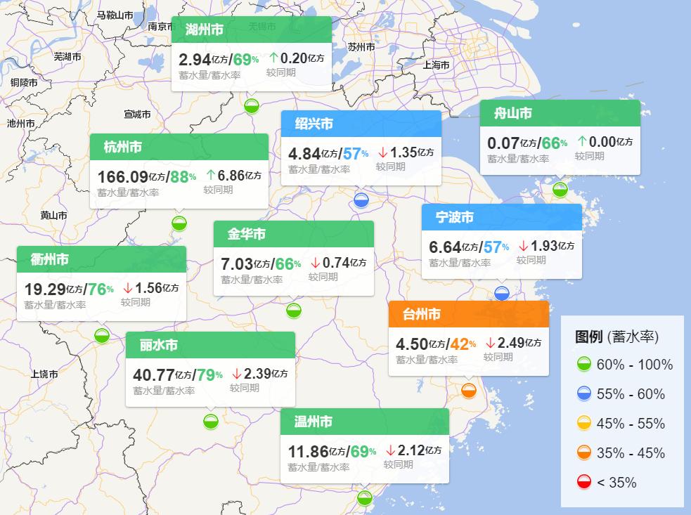 目前水库蓄水率如何?梅雨期末,全省大中型水库蓄水总量264.02亿立方米(蓄水率80.5%),较入梅增蓄28.88亿立方米(其中大型水库增蓄25.11亿立方米),较常年同期偏少5.52亿立方米。通过前期的“限电保蓄”等措施,新安江水库当前蓄水量158.02亿立方米(蓄水率88.5%),较入梅增蓄18.14亿立方米,较常年同期偏多6.38亿立方米。