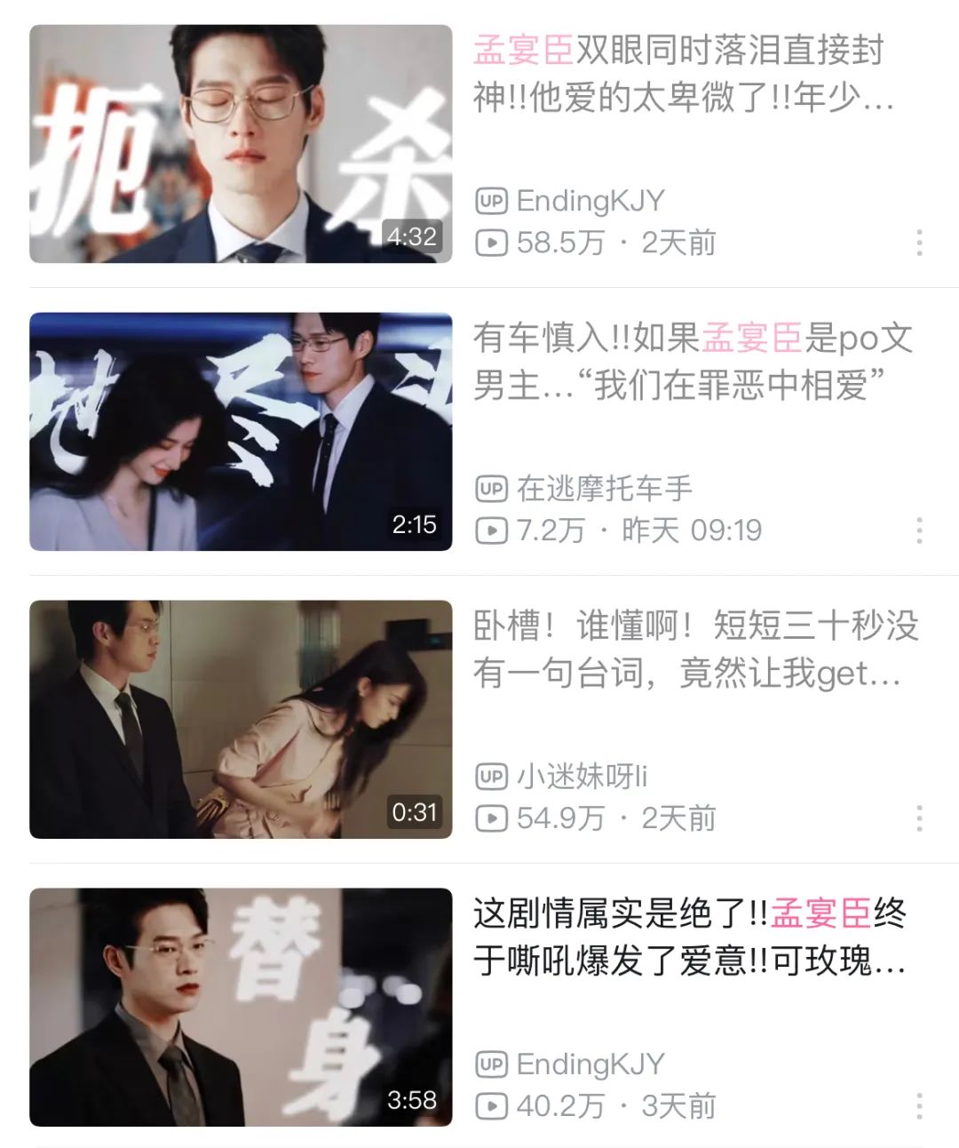 在这些情节里,我们都看到了一个一直隐忍但已经处于崩溃边缘的孟宴臣。最后是男主给观众带来的幻想感和CP嗑点的缺位,为孟宴臣的出圈添了一把火。