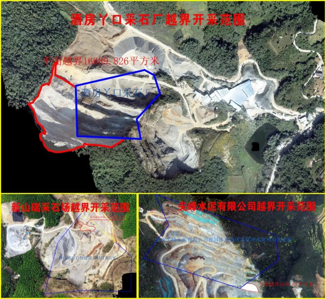 《中华人民共和国矿产资源法》明确规定不得超越批准的矿区范围采矿。督察发现,思茅区部分矿山企业法律意识淡薄,唯利是图,越界开采问题严重。根据思茅区自然资源部门组织开展的2021年度开采情况测量结果,尖峰水泥有限公司茅草坪水泥用石灰岩矿越界开采面积1659.67平方米,新山瑞采石场越界开采面积3132.90平方米,酒房丫口采石厂越界开采面积16689.83平方米(历史越界开采面积36606.73平方米)。酒房丫口采石厂因越界开采面积大、涉及矿产资源价值高涉嫌刑事案件于2022年11月移交公安机关处理。