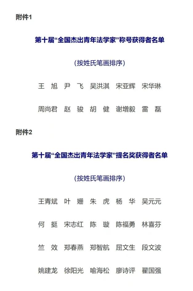 3.第十届“全国杰出青年法学家”颁奖仪式12日在京举行:中国人民大学的王旭等10名“全国杰出青年法学家”称号获得者和20名提名奖获得者受到表彰。据悉,由中国法学会组织举办的“全国杰出青年法学家”评选活动是我国法学领域的重要奖励项目。自1995年启动以来,已经成功举办十届,评选产生99位全国杰出青年法学家。这些获奖者为法治中国建设作出重要贡献。(新华社)