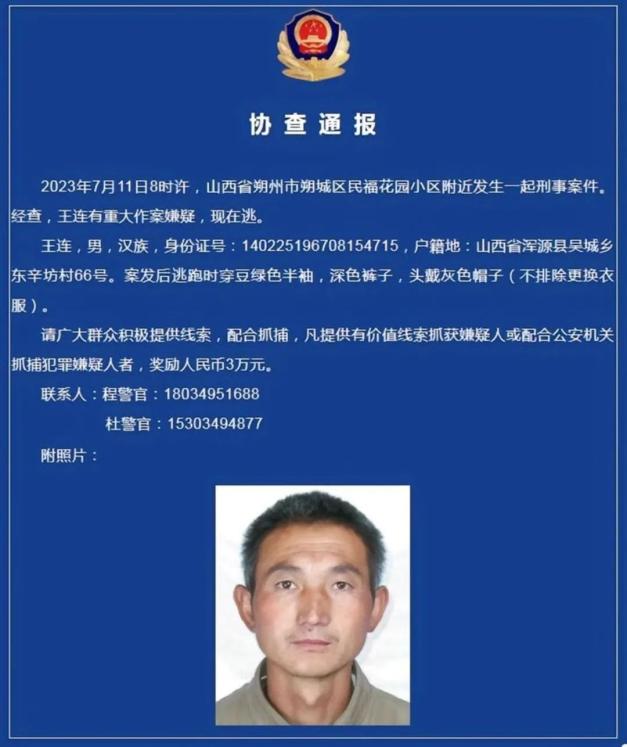 12.环卫工疑似杀害环卫队队长,警方悬赏抓捕嫌疑人:11日,山西朔州警方发布协查通报称,当日,朔州市朔城区发生一起刑事案件。经查,男子王某有重大作案嫌疑,目前在逃。凡提供有价值线索抓获嫌疑人或配合公安机关抓捕犯罪嫌疑人者,奖励3万元。据悉,王某是朔州市环卫清洁中心管理的环卫工人,被害者是环卫队队长。(楚天都市报)