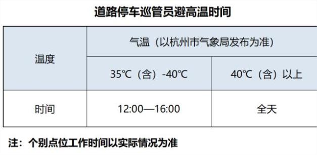 2.浙江杭州规定超过40℃全天免费停车:根据杭州市城管局发布的通知,日最高气温达到40℃以上的,应停止室外露天作业;日气温达到35℃以上、40℃以下的,应按规定减少高温时段室外作业,适当增加巡管人员的休息时间,严禁延长高温作业时间和违规加班加点。这也就相当于,若某日气温在40℃及以上,杭州巡管员全天都不用外出作业,车辆也都免费停车(除个别点位)。(杭州日报)
