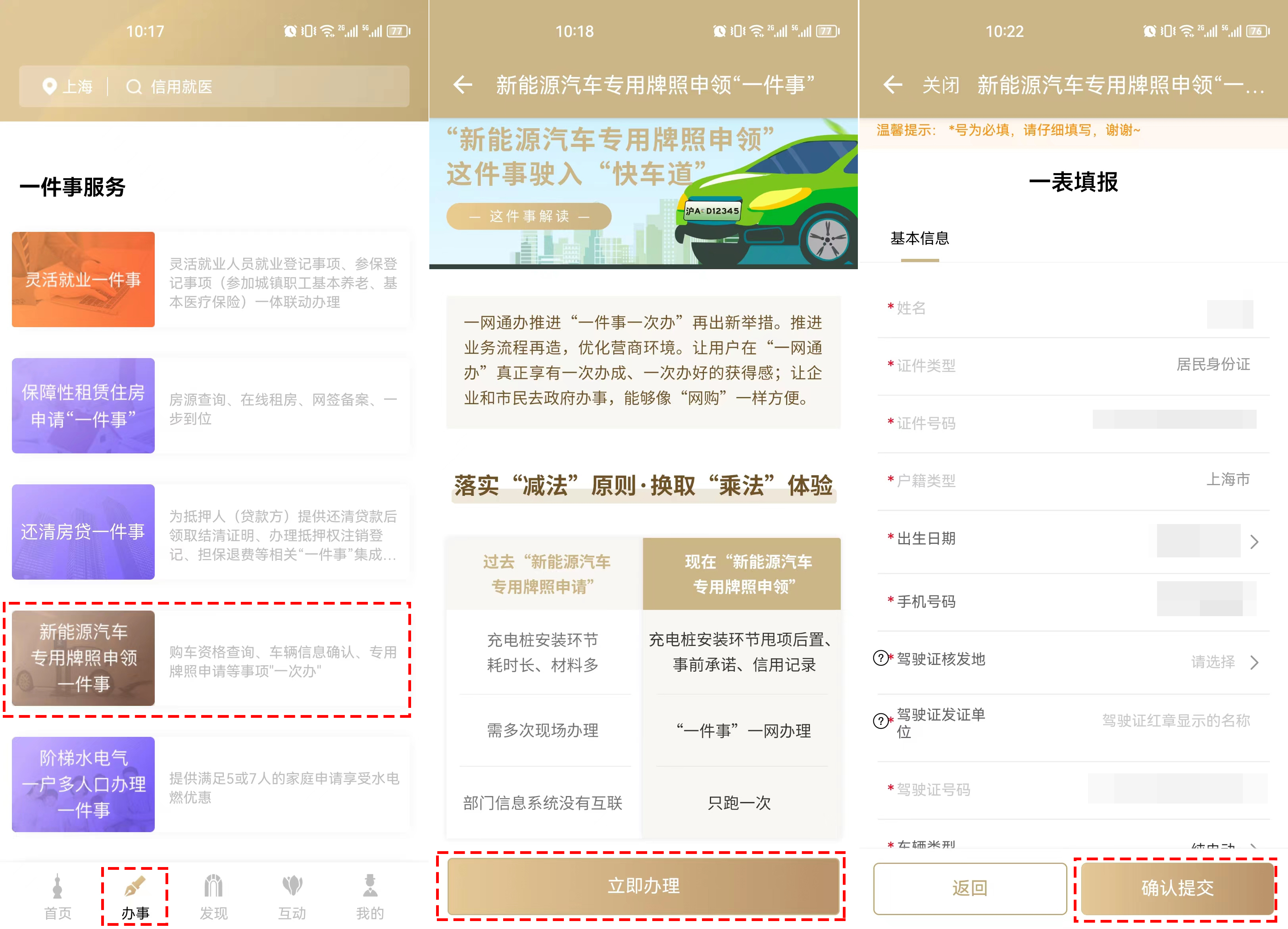 符合申领条件的市民,可登录“随申办市民云”APP→“办事”频道→新能源汽车专用牌照申领“一件事”服务,在线一次轻松办理,助你轻松获取“通行证”!