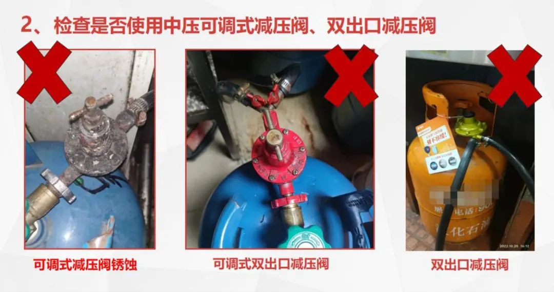 可调节减压阀使用不当容易造成燃气泄漏。因此,按照最新要求,燃气瓶只能配置固定式减压阀且严格遵守一瓶一阀一管道的标准。