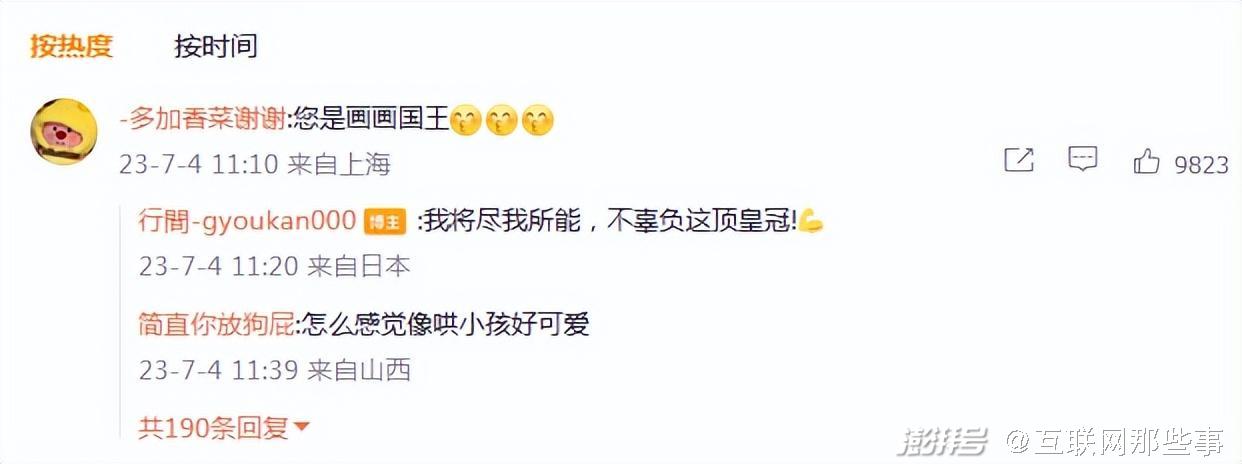 有粉丝为画师充了微博会员,使得画师ID后面会有一个会员皇冠标识。当画师问为什么会有皇冠时,评论区“您是画画国王”的回答犹如哄小孩一般。