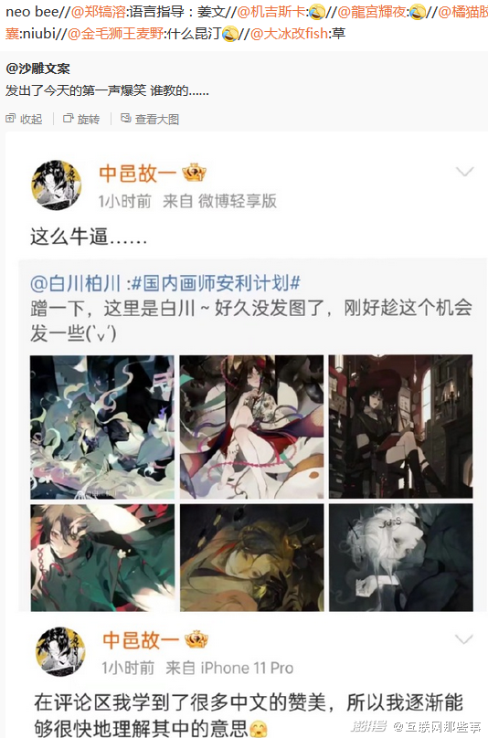 在日本画师的评论区中,有一本正经用同样的“新中国语”回应的,也有争做显眼包的。