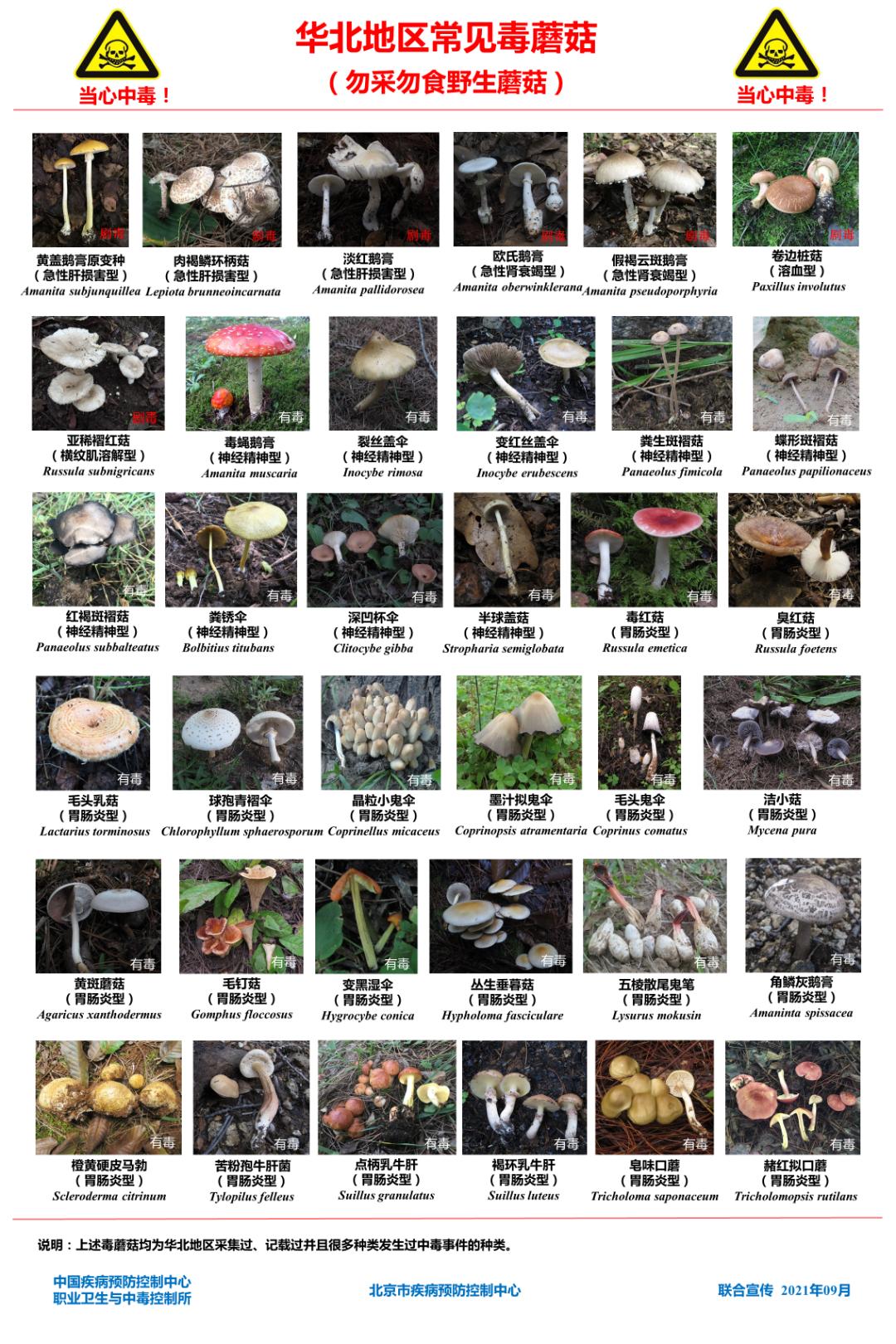 目前,在国内已报道的毒蘑菇有500多种,其中华北地区常见的毒蘑菇如下图所示: