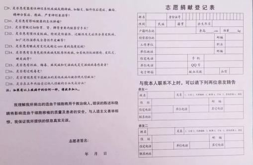 填写《捐献造血干细胞登记表》并留下用于检测HLA等的血样;当符合入库条件者产生捐献造血干细胞的愿望时,首先要到具有接受捐献造血干细胞登记条件的献血点或造血干细胞捐献者资料库管理中心及其分支机构指定的地点,填写《志愿捐献造血干细胞同意书》和《造血干细胞捐献登记表》及相关资料,并留下用于进行HLA分型等项目检测用的血样(8毫升左右)。04