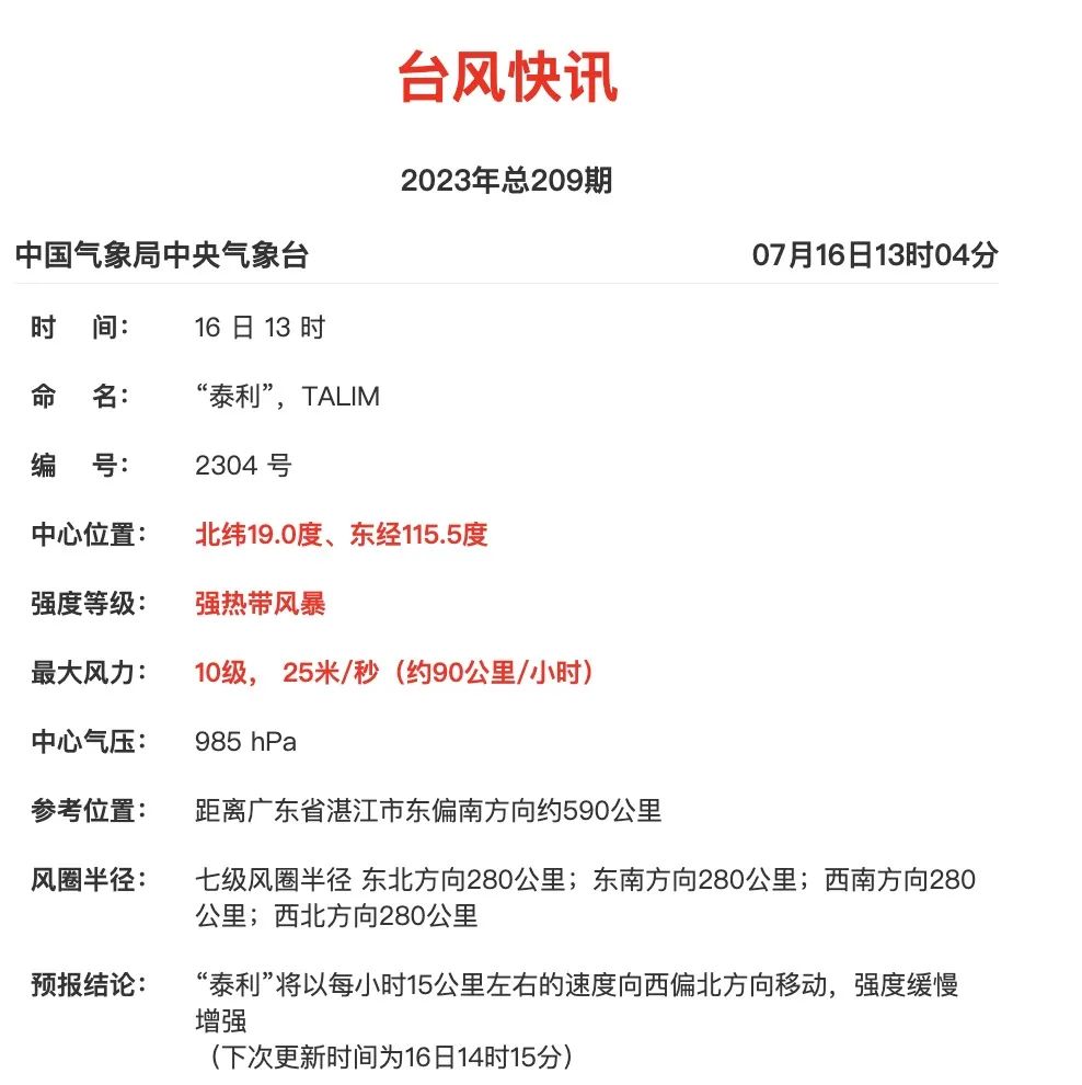 今年第4号台风“泰利”(强热带风暴级)的中心今天(16日)13时位于我国广东省湛江市东偏南方向约590公里的南海东北部海面上,就是北纬19.0度、东经115.5度,中心附近最大风力有10级(25米/秒),中心最低气压为985百帕,七级风圈半径280公里。