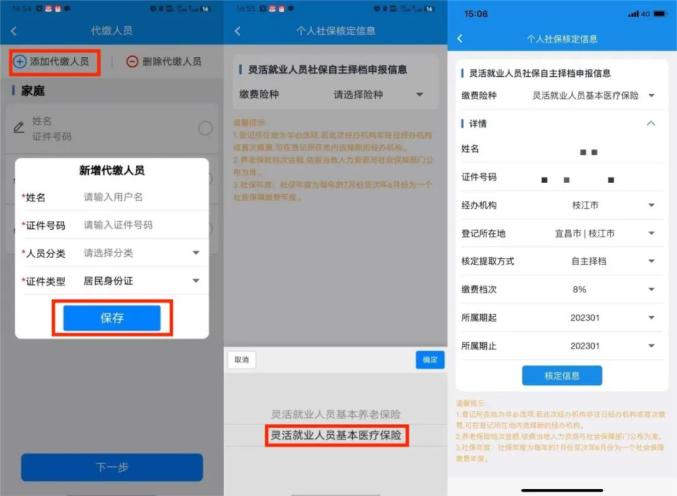 ◉ 代缴费,请点击【代缴灵活就业人员社保】菜单,点击【增加】,录入代缴人信息后点击【保存】。选中已添加的代缴人,选择缴费险种【灵活就业人员基本医疗保险】,再选择统筹区、核定方式、缴费属期、缴费档次等信息,点击【核定】。