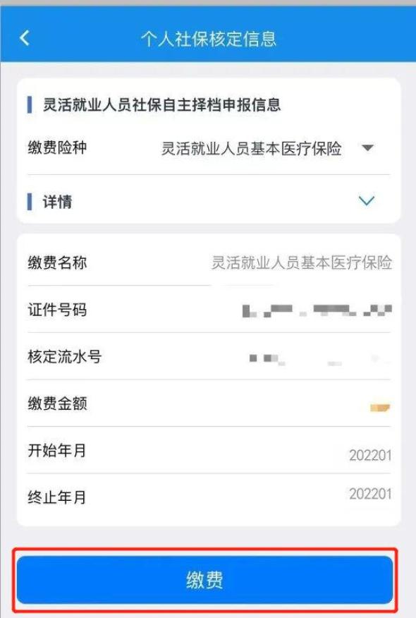 ◉ 自缴费,请点击【灵活就业人员社保缴费】菜单,系统自动提取当前登录自然人的灵活就业登记信息,选择缴费险种【灵活就业人员基本医疗保险】,再选择统筹区、核定方式、缴费属期、缴费档次等信息,点击【核定】。
