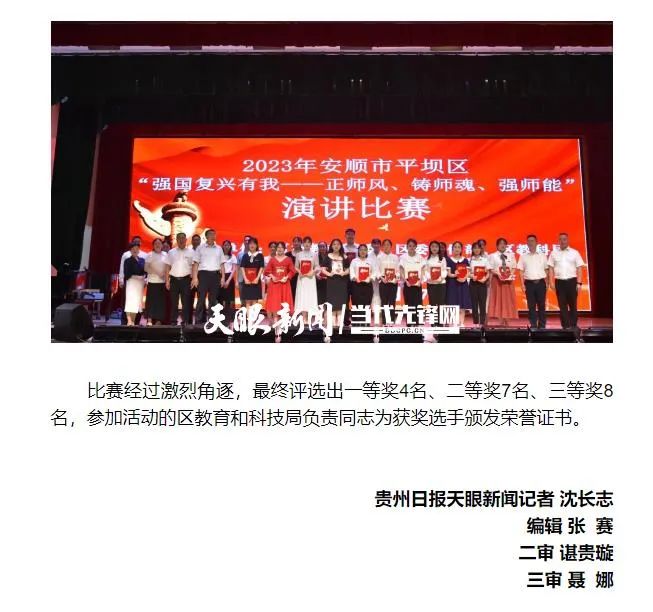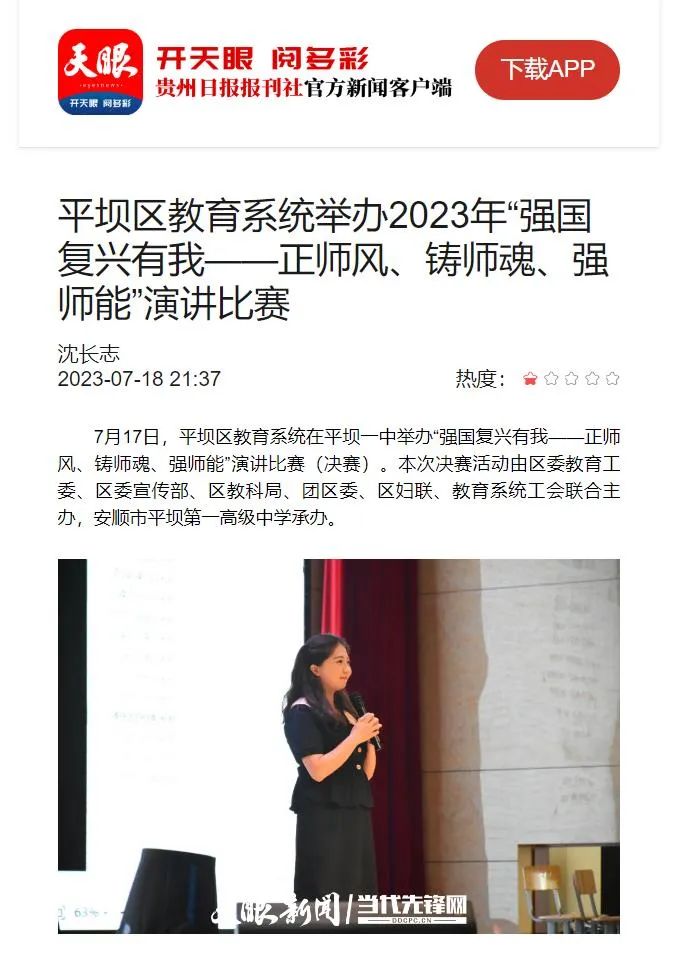 天眼新闻2023.7.18报道平坝区教育系统举办2023年“强国复兴有我——正师风、铸师魂、强师能”演讲比赛