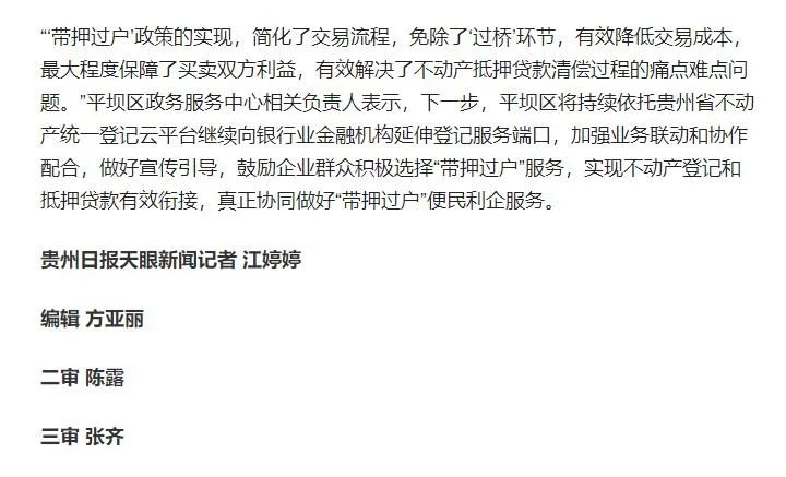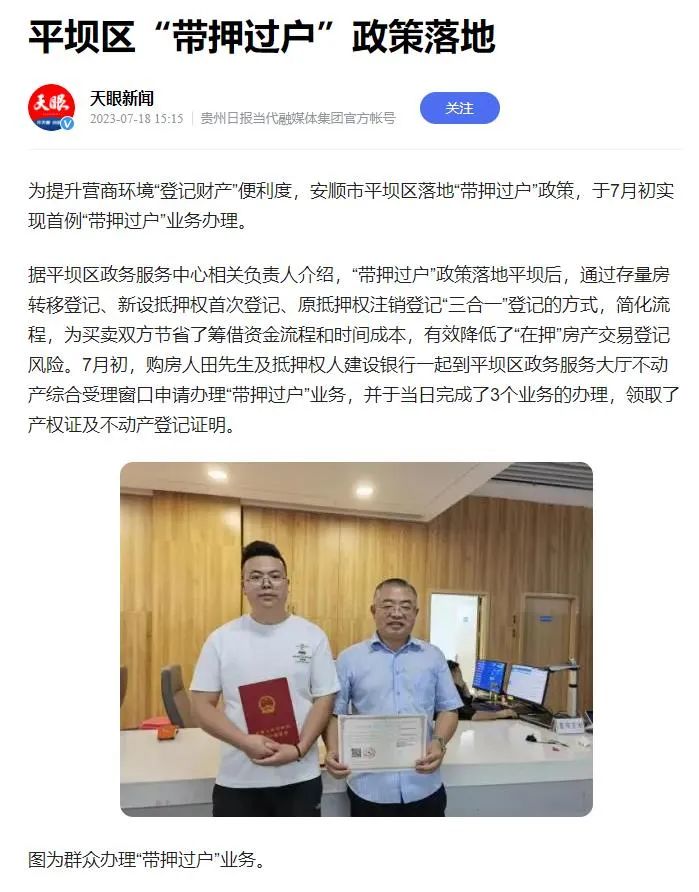 天眼新闻2023.7.18报道平坝区“带押过户”政策落地