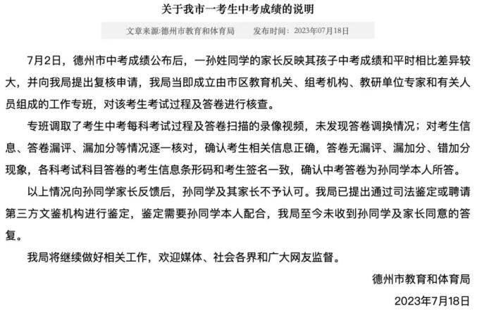 7月2日,德州市中考成绩公布后,一孙姓同学的家长反映其孩子中考成绩和平时相比差异较大,并向我局提出复核申请,我局当即成立由市区教育机关、组考机构、教研单位专家和有关人员组成的工作专班,对该考生考试过程及答卷进行核查。