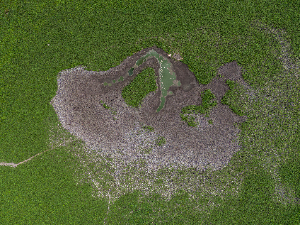 当地时间2023年7月20日,波兰Skrzatusz,由于气候变化导致的持续干旱,一个未命名的湖泊上干燥开裂的土壤鸟瞰图。视觉中国 图