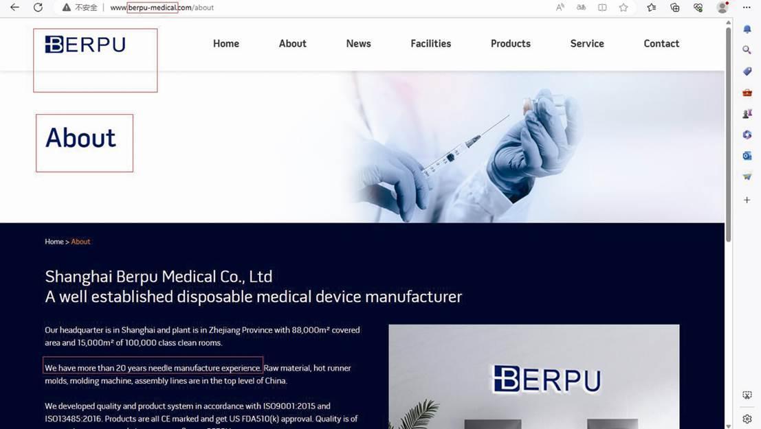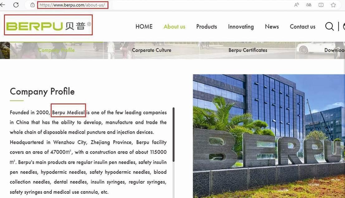 打开上海贝朴进出口的公司官网http://www.berpu-medical.com,可以发现,该企业英文名称中的Berpu Medical极易让人将该企业和贝普医疗英文名混为一体,其网页更介绍(见图三):Our headquarter is in Shanghai and plant is in Zhejiang Province with 88,000m2 covered area and 15,000m2 of 100,000 class clean rooms.We have more than 20 years needle manufacture experience.