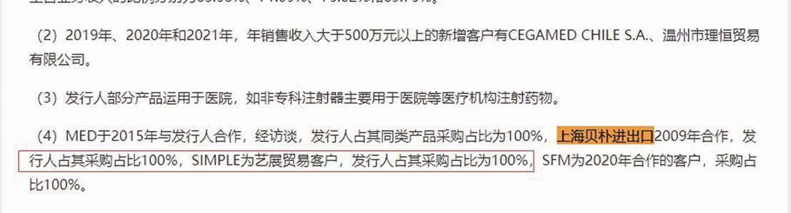 贝普医疗认为:“上海贝朴进出口基于对公司经营能力及产品质量的认可,选择仅向公司采购相关产品,双方至今已合作十年以上,作为公司ODM客户,其基于厂商经营能力、产品质量及价格、合作年限等因素市场化选择供应商,公司长期为其稳定供应高质量产品,其将相关产品全部向公司采购具备一定合理性。”