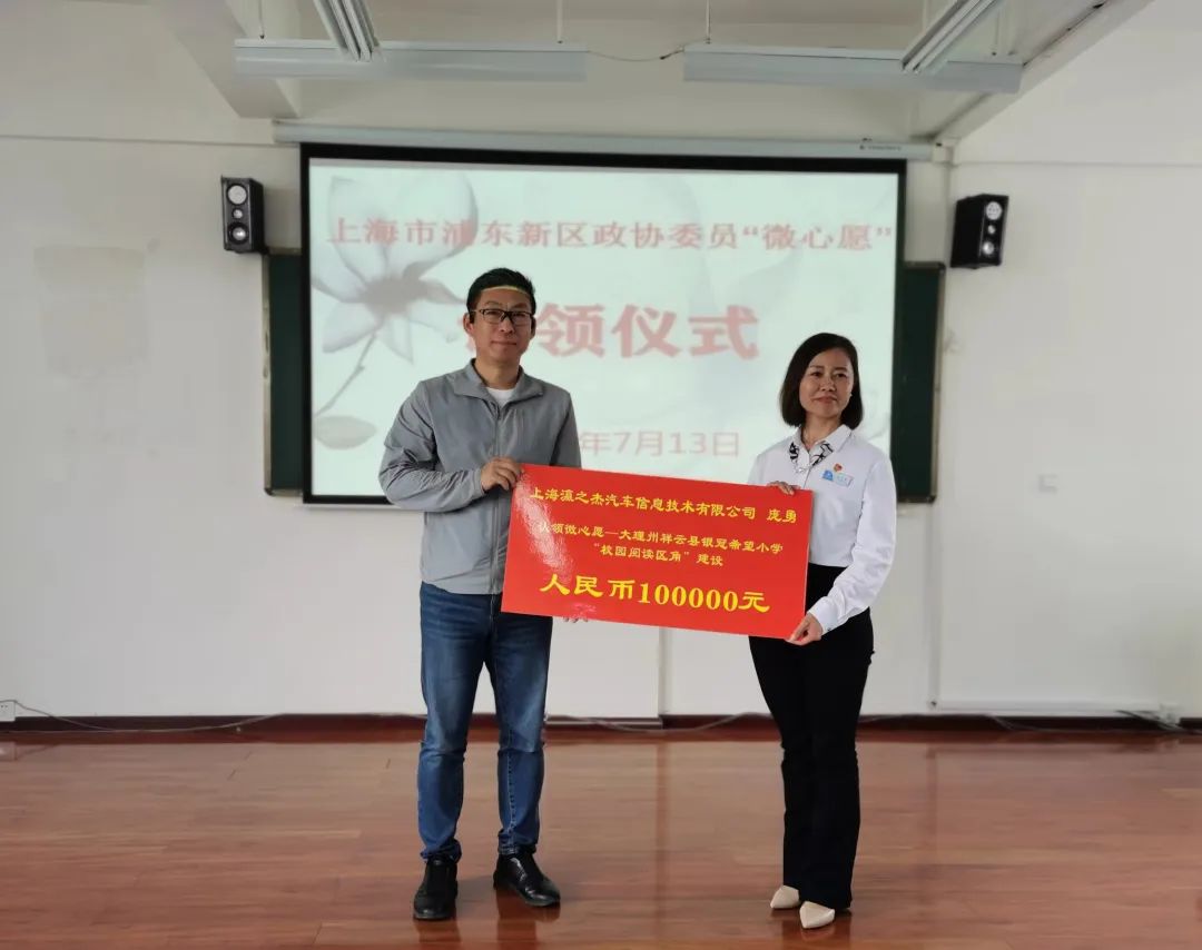庞勇委员认领祥云县“微心愿”项目庞勇委员代表上海瀛之杰汽车信息技术有限公司认领祥云县银冠希望小学“校园阅读区角”建设项目10万元,韩旻委员代表翱捷科技股份有限公司认领宾川县东升完小、拉乌完小设备购置项目5万元及福贡县子里甲乡、石月亮乡中心敬老院设备购置和马吉乡、子里甲乡小学助学项目15万元。
