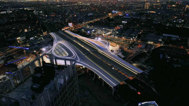 道路车水马龙亮灯后的虎门站更是光彩夺目