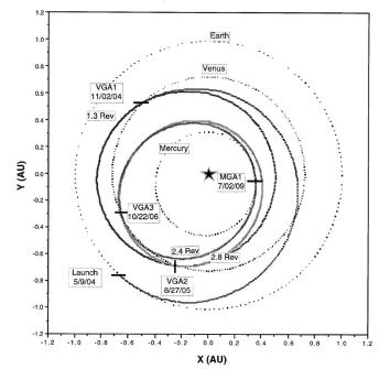 信使号探测水星的艺术想象图。图片来源:NASA在信使号被选中后,刘贞婉在2001年发表的论文中为它设计了8条新轨道[5]。其中第7条轨道的规划是:信使号于2004年5月9日被发射,然后3次飞掠金星(VGA1、VGA2与VGA3),最后飞掠1次水星(MGA1),最后于2009年7月2日进入环绕水星的轨道。