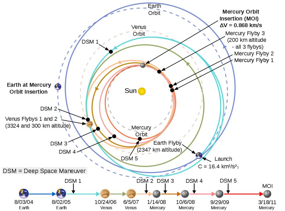 信使号搭载三角洲II号火箭升空的情景。图片来源:NASA此后,信使号于2005年8月2日、2006年10月24日、2007年6月5日、2008年1月14日、2008年10月6日与2009年9月29日,先后飞掠地球、金星、金星、水星、水星与水星。除了这6次飞掠之外,信使号还进行了5次深空机动(DSM)操作,即点燃助推器,执行轨道修正。