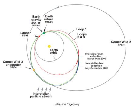 1、1999年2月7日升空(红方块所示,图中误标为6日);2、绕红轨道运行,于2000年3月-5月搜集星际尘埃;3、2001年1月15日飞掠地球(蓝方块所示,大部分被绿色方块覆盖);4、2002年11月2日,飞掠小行星“5535安妮·弗兰克”(5535 Annefrank,图中未标注);5、沿蓝轨道运行,于2004年1月2日与怀尔德2号(Wild-2)彗星相遇(黄方块所示),采集后者物质;6、继续沿蓝轨道运行,于2002年7月-12月再次搜集星际尘埃;7、2006年1月15日返回地球(绿色方块所示)上空,探测器将样品返回舱丢向地球大气后离开。