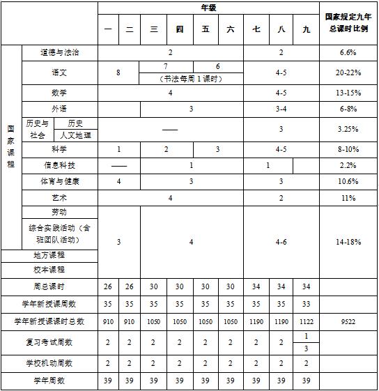 浙江省义务教育课程设置及比例