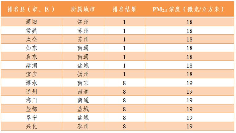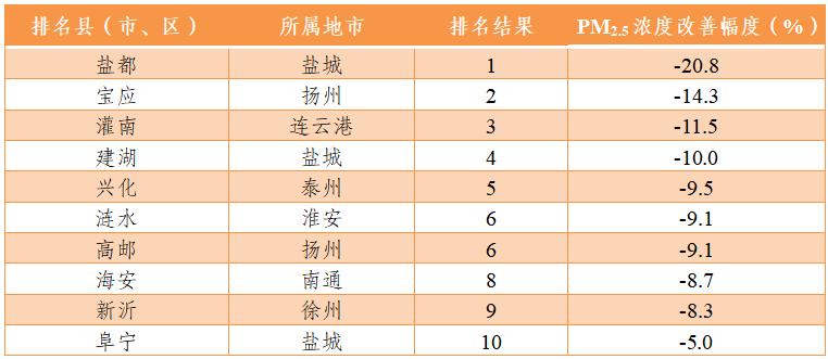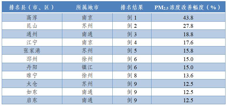 PM2.5浓度改善幅度相对较差的后10位(倒1—10名)依次是:高淳、昆山、通州、江宁、张家港、邳州(丹阳并列)、睢宁、太仓(如东、启东并列)