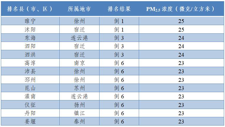 PM2.5浓度相对较差的后10位(倒1—10名)依次是:睢宁(沭阳并列)、东海(泗阳、泗洪并列)、高淳(沛县、邳州、昆山、灌南、仪征、丹阳、姜堰并列)