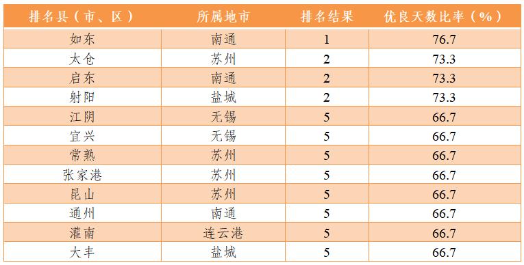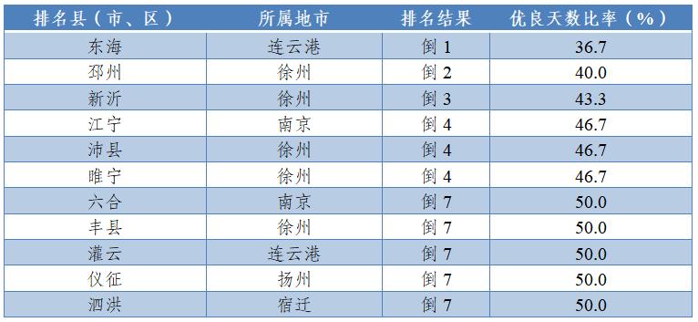优良天数比率相对较差的后10位(倒1—10名)依次是:东海、邳州、新沂、江宁(沛县、睢宁并列)、六合(丰县、灌云、仪征、泗洪并列)