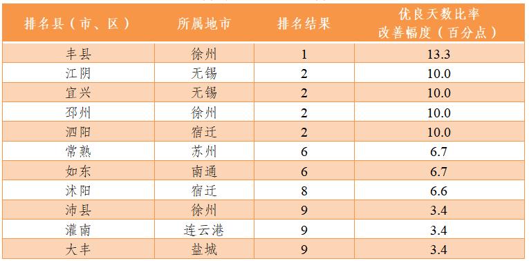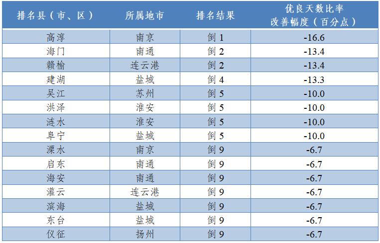 优良天数比率改善幅度相对较差的后10位(倒1—10名)依次是:高淳、海门(赣榆并列)、建湖、吴江(洪泽、涟水、阜宁并列)、溧水(启东、海安、灌云、滨海、东台、仪征并列)